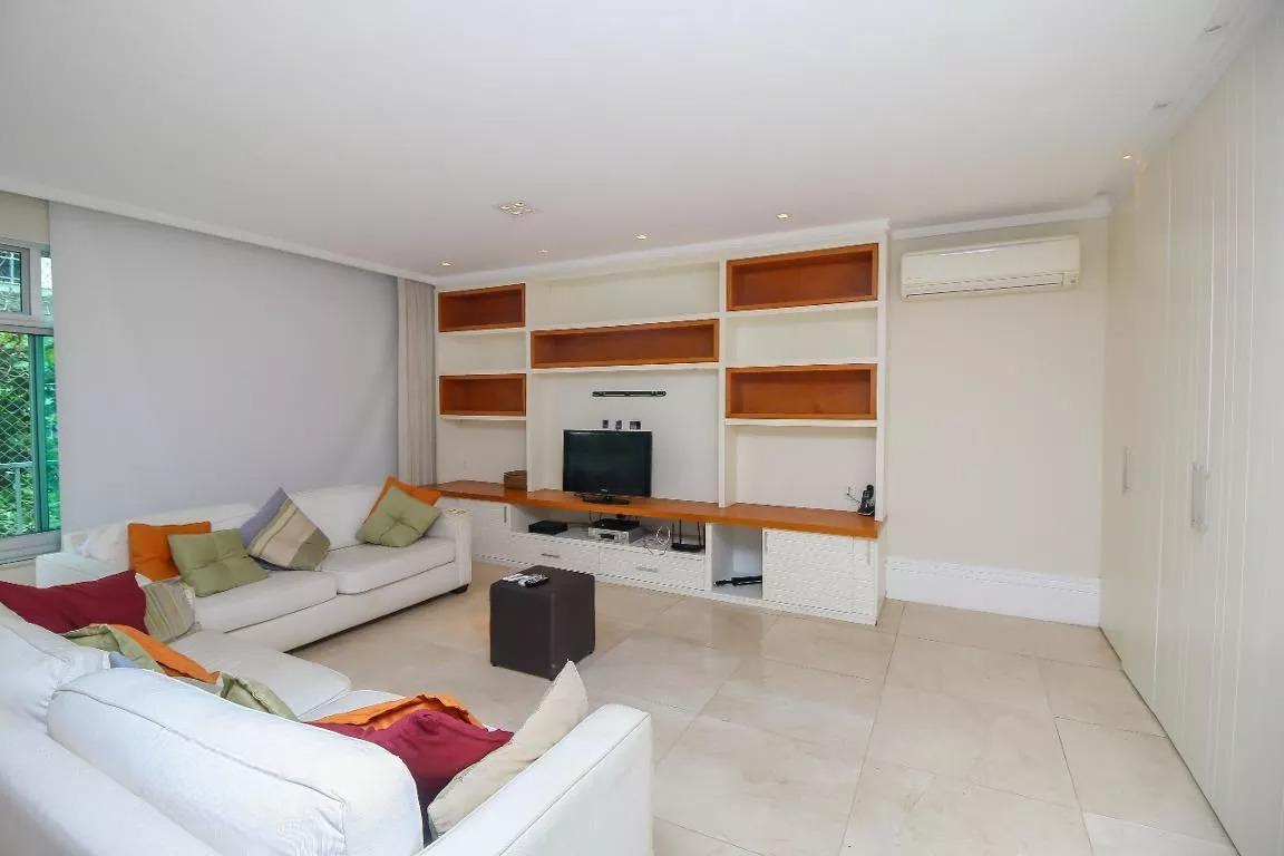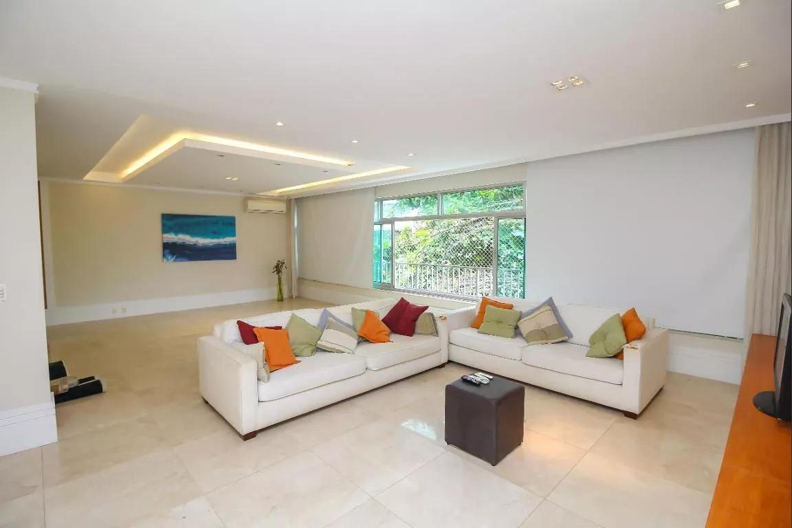 LEBLON QUADRÍSSIMA PRAIA!! Aristides Espínola. Excelente Triplex com 330m2, totalmente reformada, originalmente 4 quartos, transformada em 3 quartos, sendo 2 suítes, toda equipada com ar condicionado em todos os cômodos (inclusive cozinha), marcenaria planejada e portas blindadas (principal e acesso ao terraço). 1 Andar: Amplo salão em L com grandes janelas com vista pras copas das árvores, 3 quartos, sendo 2 suítes com closets, banheiro social, lavabo, cozinha grande, dependência completa de empregada e área de serviço (planta circular); 2 Andar (acesso por escada linear): Amplo salão, com janelas grandes, sala de TV, escritório e lavabo; Terraço (acesso por escada linear): Terraço com churrasqueira, sauna, piscina, chuveiro, lavabo e vista para o mar. Prédio aconchegante, bem administrado, com acessibilidade, portaria 24hrs e com 1 vaga na escritura + uma na convenção